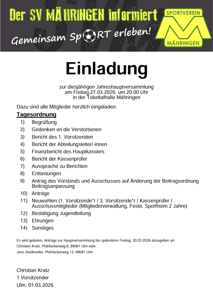 „Wir freuen uns über jedes neue Mitglied. Aus diesem Grund steht Ihnen in beigefügtem Link unsere Beitrittserklärung zur Verfügung. Bitte füllen Sie das Formular aus und werfen es in den Vereinsbriefkasten des SV Mähringen im Schulweg 18.“